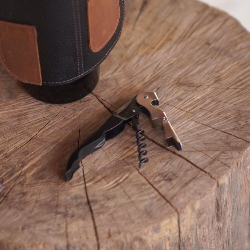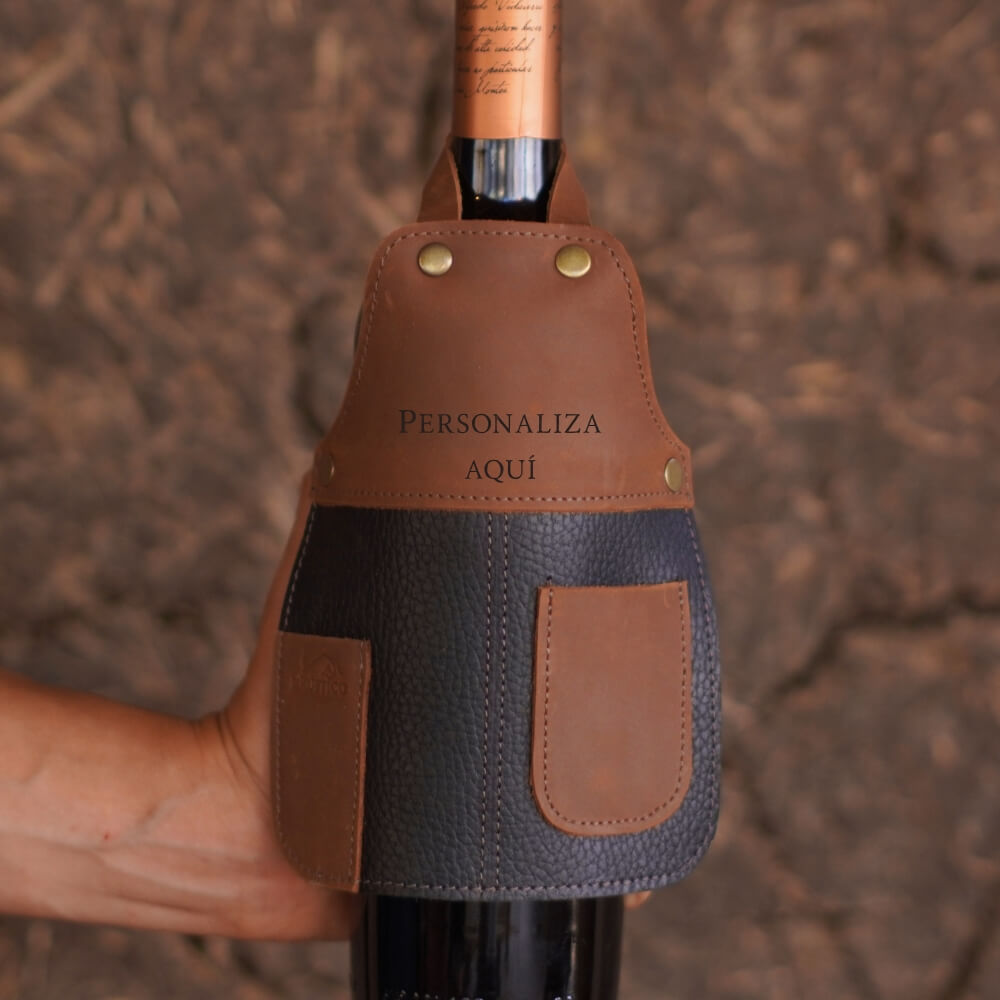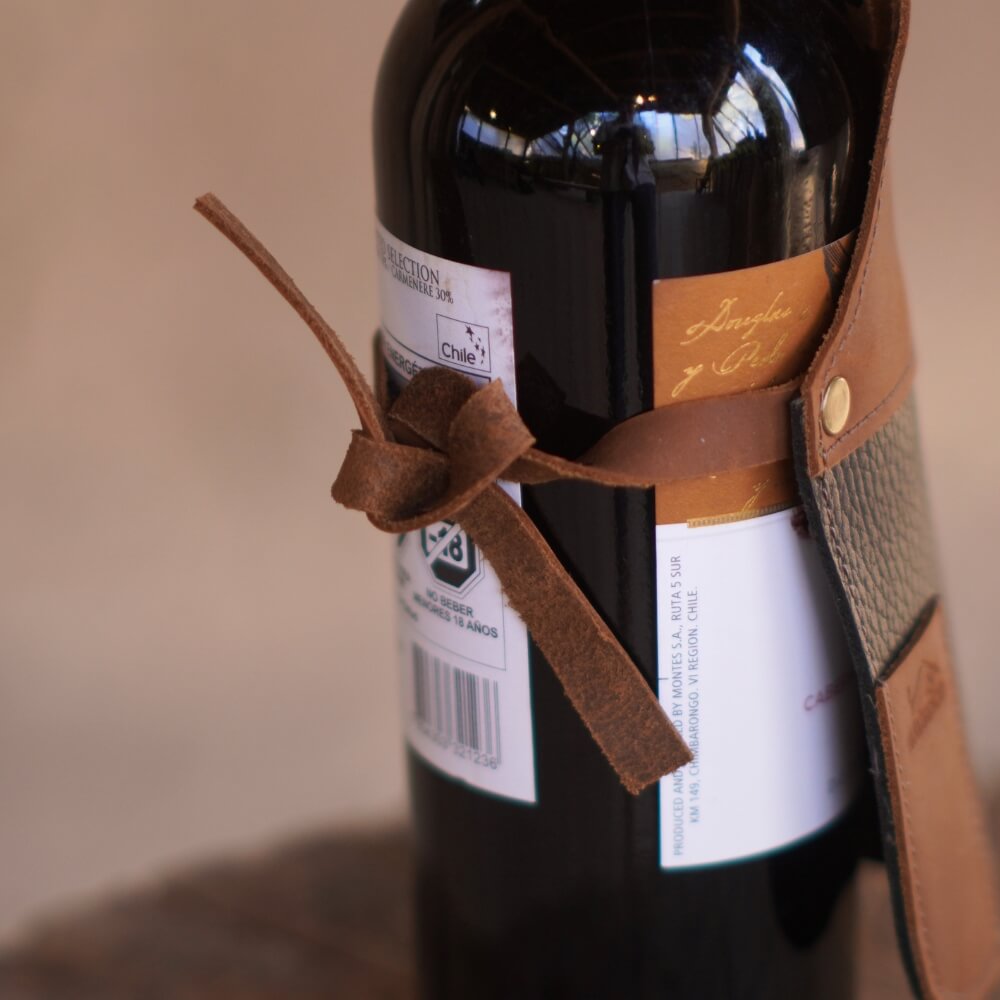 Pecherita de cuero con sacacorchos, ajustable para cualquier botella.